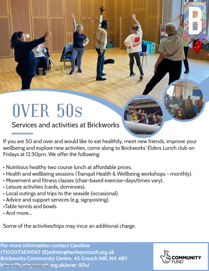 Come along to Brickworks’ Over 50s Elders Lunch Club every Friday at 12:30pm. Enjoy a healthy two-course meal, wellbeing sessions, fitness activities, games, and trips – a great way to eat well, stay active, and meet new friends.